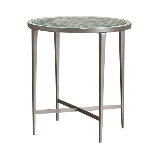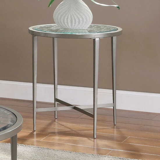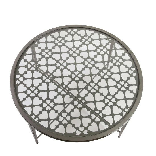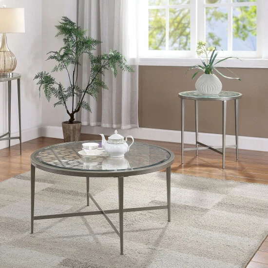 Provide a sophisticated place to put down drinks and snacks with this two-piece accent table set from Furniture of America. Created for the Fage collection, this pair features steel legs to provide firm support to the tempered glass round tabletops. A heart motif adorns the glass tops for a sweet and special touch for your living space. Attractive and durable, the X-shaped base ensures extra stability. This three-piece set combines its metal structure and thin tapered legs with the silver satin-plated finish to make this set the ideal centerpiece in your living area. Choose this set to add contemporary and modern appeal to your space.