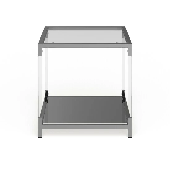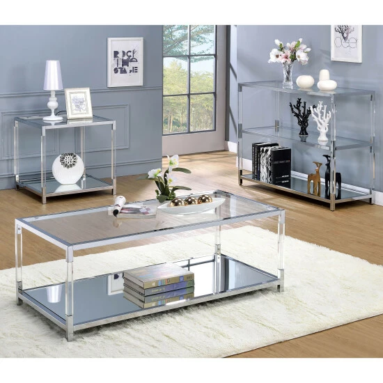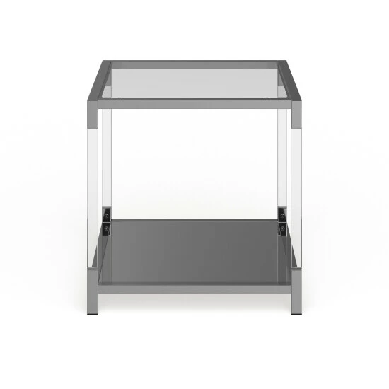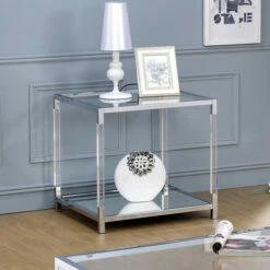 Take a contemporary room to the height of cosmopolitan personality and radiant elegance. The Fald modern chrome metal and glass end table hits on all cylinders of updated custom décor with a futuristic vibe. Adding lightness and radiance to a custom living room or family entertaining space, this chic square end table from Furniture of America represents the best of updated design as it fulfills functional utility. Clear acrylic support bars join chrome finish metal brackets and a chrome finish metal frame, as a clear glass top and reflective mirrored bottom surface adds an unexpected dose of glam. This ultra-modern end table is a perfect choice for high-traffic spaces looking for an updated slick flavor.
