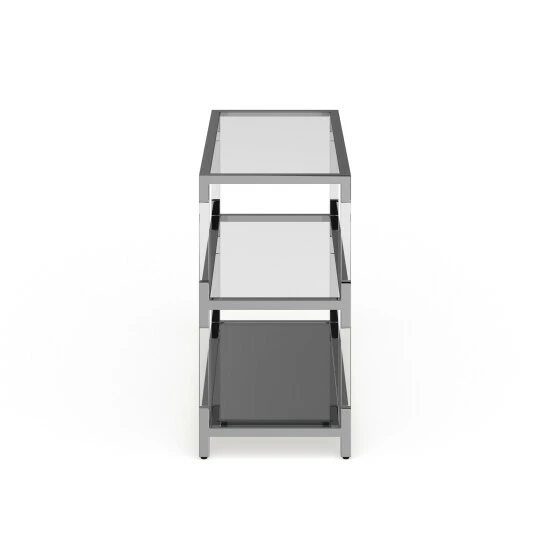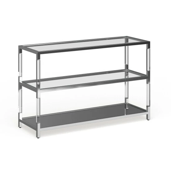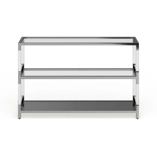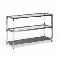 Bump up your decor with the cosmopolitan personality and radiant elegance of this console table. The modern chrome metal and glass sofa table hits on all cylinders of updated custom decor with a futuristic vibe. Adding lightness and radiance to a custom living room or family entertaining space, this chic rectangular sofa table represents the best of updated design as it fulfills functional utility.