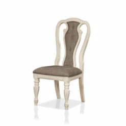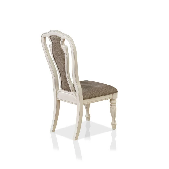 Romantic inspiration stylizes this elegant set of two side chairs by Furniture of America. Bring a custom look to a traditional or transitional space with this Fant chair set, showing your commitment to artisan decor. Solid wood and wood veneer construction offers a sturdy look and feel as it softens a space with a creamy whitewash finish frame. Exquisite scrolled elements produce an alluring silhouette dressed up with a rounded chair back with open spaces, straight arms, curved back legs, and turned front legs. A Queen Anne design works in a contemporary use of fabric, adding ash brown upholstery on its padded seat and as a center back insert with a charming vertical row of buttons. Choose this tasteful chair to express a signature design stamp in a dining room or living space.
