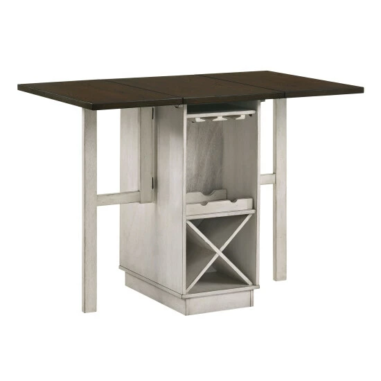 The ultimate in versatility, perfect for a compact space, this five-piece counter height dining set includes a drop-leaf design and backless stools. With stemware and wine bottle racks in the table base, this ingenious design keeps favored vintages close at hand.