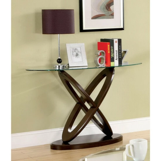 Lend contemporary charm to your living space with this stylish sofa table. The table features an eye-catching solid wood base in a dark walnut finish, crafted in the shape of interlocking oval rings over an oval base. The durable, oval-shaped tempered glass top adds to the modern appeal of this beautiful table, making it the perfect place to display your art and collectibles.