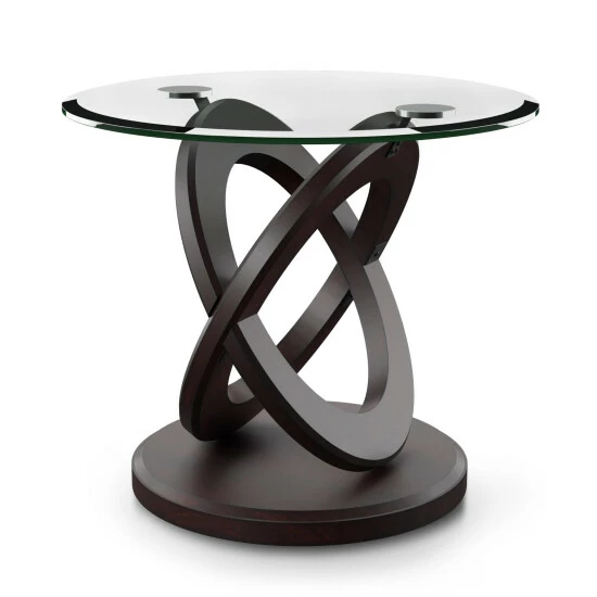 Savor the uniquely graceful, eye-catching design of this end table. Crafted of durable tempered glass on top, the circular tabletop sits atop the bold, thick, crossed wooden oval base. The rich, dark walnut finish is versatile enough for nearly any space, while the robust, resilient glass top offers the ideal spot for tea.Β