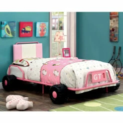 Delight any child with this race car themed Racing Bed and Nightstand Set. The twin bed features realistic plastic wheels and the bed frame is solidly constructed with metal components for stability and durability. The headboard offers a striped and padded faux leather panel for comfort. A metal nightstand offers two shelves to keep clutter at bay. Available in two color selections to please the boy or girl in your family. Matching desk and closet are available separately to complete your child’s bedroom.