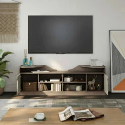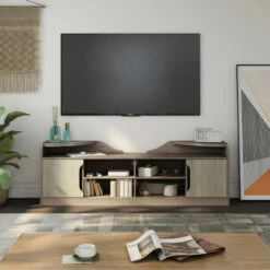 Rustic Farmhouse to Urban Industrial, this Fetz Brown TV Stand has you covered. Minimalist design puts the focus on the beautiful two-tone look of this TV console. Contrasting cabinet doors in a lighter chestnut wood finish with sleek cutout door pulls store items out of sight to keep your space tidy and organized. Four open shelves with panel back cutouts for wire and cable management accommodate numerous media components, as well as quarter round shelves floating above the console top for display items. Form and function combine in this Furniture of America essential piece for your living or family room.