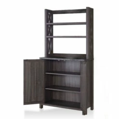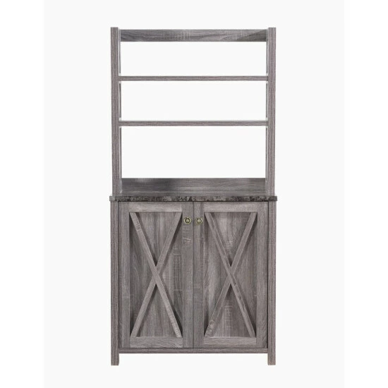 This rustic farmhouse hutch cabinet maximizes storage in your kitchen. The cabinet has two open shelves at the top and a two-door cabinet at the bottom stores items on interior shelves. X-panel details are classic farmhouse elements. With a convenient prep area, this hutch cabinet does double duty as extra counter space or a bar. It also has an open back for plugging in appliances.