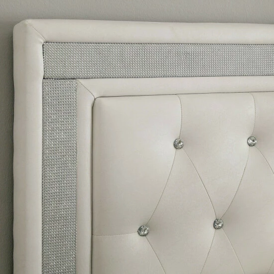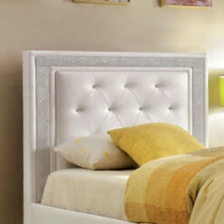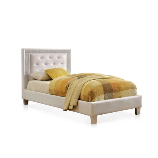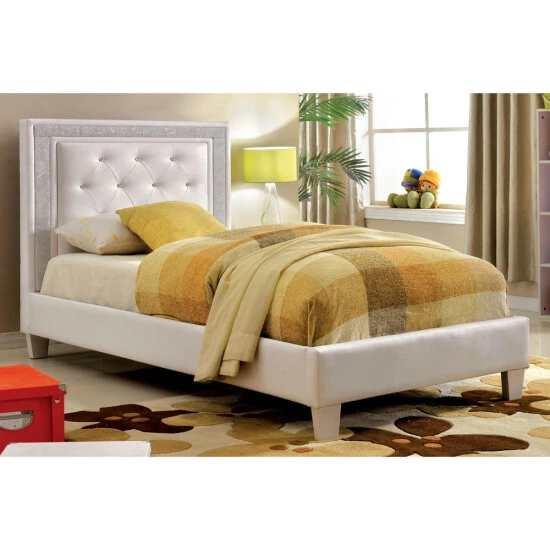 Create a contemporary and charming child’s room with this Fima Contemporary Twin Platform Bed. This fully upholstered platform bed adds a soft and feminine touch as an anchor piece and will coordinate beautifully with any decor or themed bedroom. Crisp white faux leather upholstery wraps the entire frame and modern high headboard while a metallic mesh accents and trims the crystal buttoned and deep tufted panel of the headboard. The bed rests on tapered wood block feet and creates a tailored profile. This bed includes the slat set, making it mattress ready at assembly, and is offered in an alternate color to appeal to any color palette.
