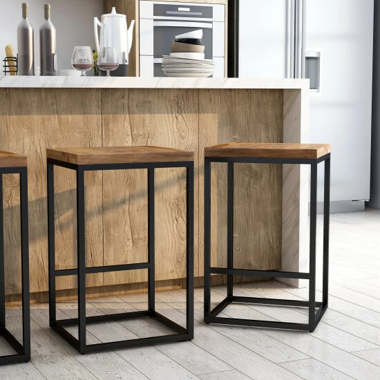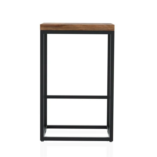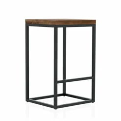 The unintrusive design of this stool offers a delightfully minimalist-style kitchen. Their solid wood Sheesham seat, originating from Indian rosewood, is a golden-brown chestnut color with dark vivid graining. Though this seat maintains a clean look, the footrest in the black bar frame makes for comfort.