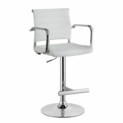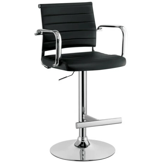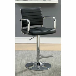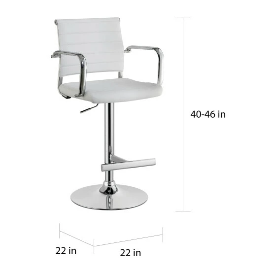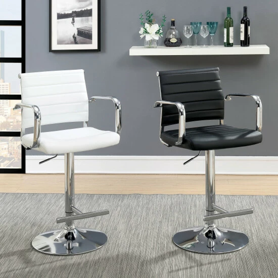 Lighthearted elegance cops to a cool retro inspiration in the design of the Fito modern padded bar stool. From Furniture of America, this dazzling stool makes a great addition to a casual yet updated kitchen, nook, or bar space. Comfy seating on a slender foam-filled seat with just the right amount of padding coordinates with a gently curved padded backrest. Wrapped in smooth faux leather with horizontal stitching, its seating base features thick metal armrests for extra comfort. A brilliant chrome finish metal base unit resembles a barbershop theme, with a built-in bar footrest, pole support, and a round base. Adjustable height settings using a pneumatic gas lift tailor the seating experience. Choose an upholstery finish to blend perfectly with surroundings.