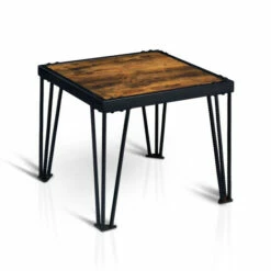 With a truly artisan approach to industrial design, the Fizi square wood and metal end table becomes a fixture and focal point in a custom casual space. Choose this end table as a primary focus delivering character and rich color, as well as ample surface room for display. A burnt wood look on its wood tabletop engenders nature-inspired ruggedness with a hint of marbled elegance. Thick black finish metal casings match charming three-rod hairpin legs, a telltale nod to Mid-Century Modern design. Bolt corner accents play up the industrial motif and add to a secure construction. This end table creates a stylistic attitude in any room.