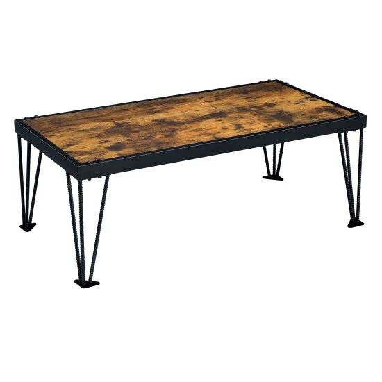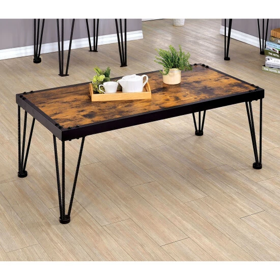 With a truly artisan approach to industrial design, the Fizi black metal coffee table becomes a fixture and focal point in a custom casual space. Choose this coffee table as a primary focus delivering character and rich color, as well as ample surface room for display. A burnt wood look on its wood tabletop engenders nature-inspired ruggedness with a hint of marbled elegance. Thick black finish metal casings match charming three-rod hairpin legs, a telltale nod to Mid-Century Modern design. Bolt corner accents play up the industrial motif and add to a secure construction. This coffee table creates a stylistic attitude in any room.