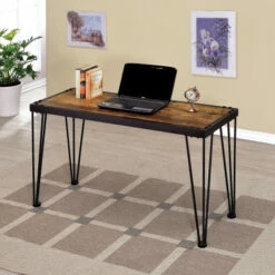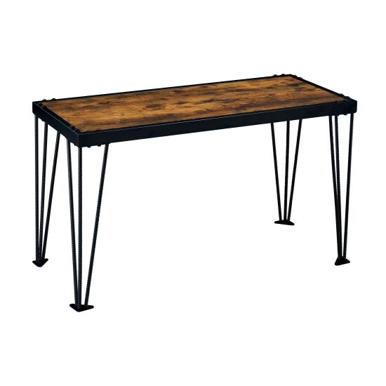 The Fizi Sofa Table pairs industrial design with rustic style for a bold, warming aesthetic. Resting on triple bar legs, it features a stunning burnt wood tabletop that brightens against the dark metal framework. Nailhead trim adds industrious detail and the open bottom promotes an airy atmosphere. Sleek and stunning, personalize this piece with decor or house a calming lamp for an earthy, rustic ambiance.