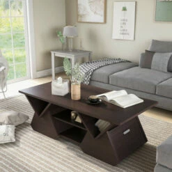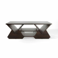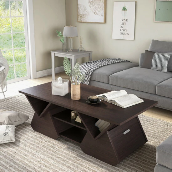 You won’t fail to get compliments when you update your home decor with this eye-catching modern coffee table by Furniture of America. Crafted to showcase bold angles and innovative geometric shapes in a rich espresso finish, this modern coffee table features elegance in multiple shelves and two enclosed compartments with drop-down doors for plenty of storage space. The geometric base of this espresso coffee table provides support so you can use this piece for years to come. Made from wood and veneer, it doubles as an accent table that provides plenty of storage. It’s a bold way to upgrade the ambiance of your living room or den.