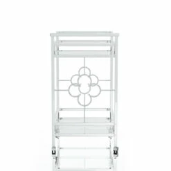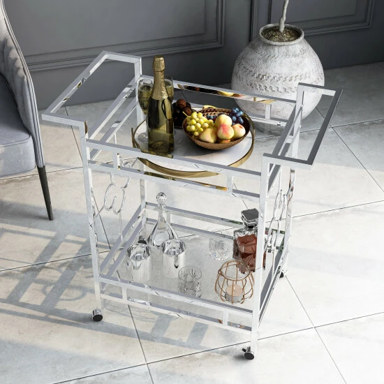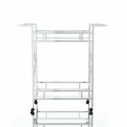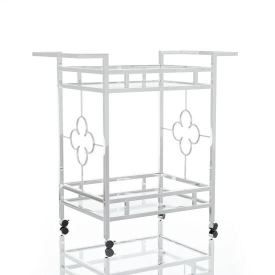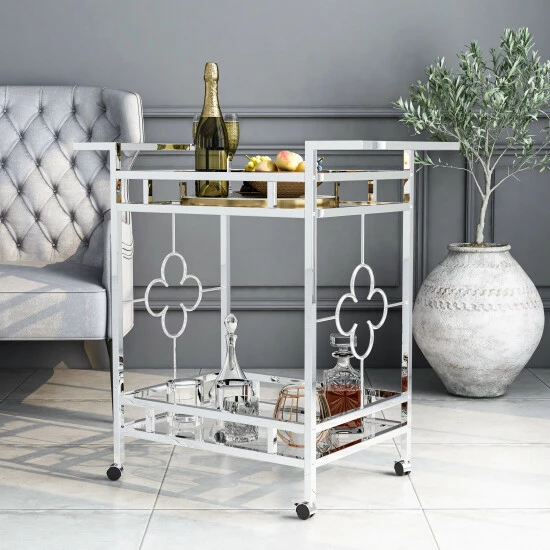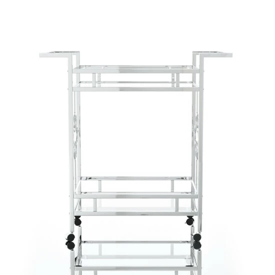 Give your entertainment space some convenience and glam with this contemporary chrome 2-shelf serving cart from Furniture of America This gorgeous cart comes with caster wheels for ease of mobility wherever the gathering is. A steel frame with a gleaming chrome finish gives it plenty of glam, while a quatrefoil motif on each side offers added stylishness. Two tempered glass shelves and two towel racks give this cart plenty of amenities to help make your next get-together memorable.