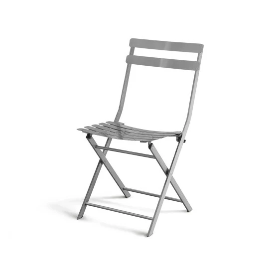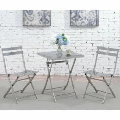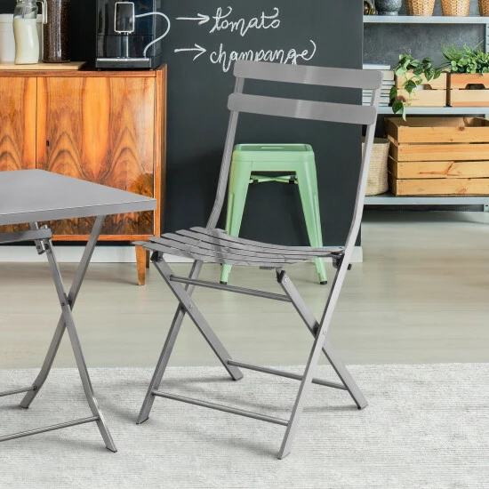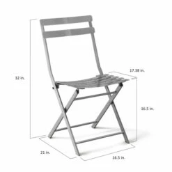 An exquisite fusion of cozy comfort and sleek, modern style, this set of two silver side chairs is sure to impress. These stylish chairs offer a convenient, foldable design that allows them to tuck neatly away into a closet or corner when not in use. The metal frames are sleek and chic with slatted seats and backs for a classically simple silhouette. Designed with a curved seat for comfort, these chairs provide versatile, sturdy seating at a moment’s notice. Sturdy, stainless steel craftsmanship ensure exceptional durability that will last for years to come. A matching bistro table is also available, sold separately.