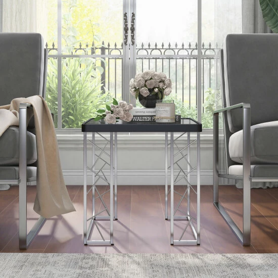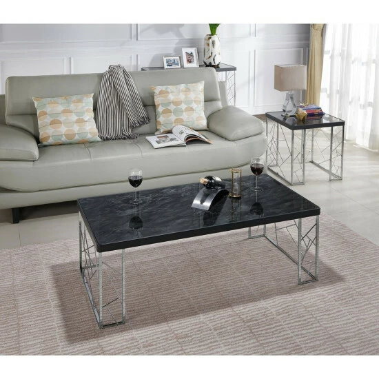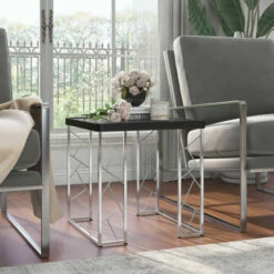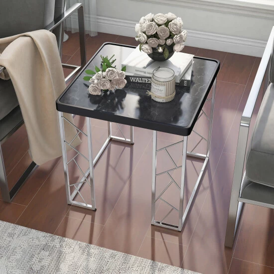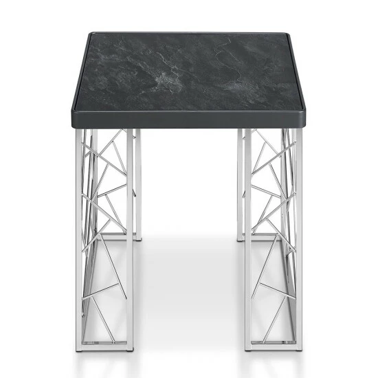 Entrance guests with a statement by placing this sleek, modern faux marble end table beside any seating. The chrome legs create a stunning visual with their edgy geometric pattern. Eyes instantly gravitate to the black marble-like surface encased within glass. Use this piece to approve the appearance and storage of your living space.
