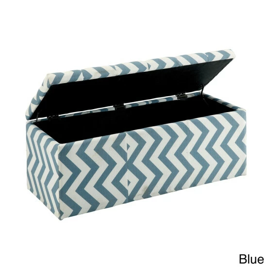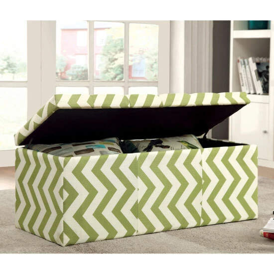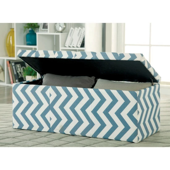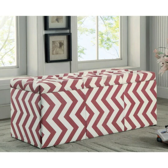 Give your home a sudden jolt of energy with the vibrant design and cute functionality of this contemporary style storage bench from Furniture of America. Featuring a pop of color in a chevron motif that stylishly electrifies any space, this padded bench is carefully constructed with linen-like fabric to simultaneously provide increased seating space and enhance surrounding home decor. Diamond and panel stitching add elegant detail while foam cushioning ensures lasting comfort. With a spacious lift-top compartment, the storage bench brings functionality and colorfully comfortable design to your home. Keep it handy for an extra seat when you have a full house of guests, or use it as storage behind your favorite living room sofa or as storage at the foot of the bed. Available in multiple colors that suit your tastes.