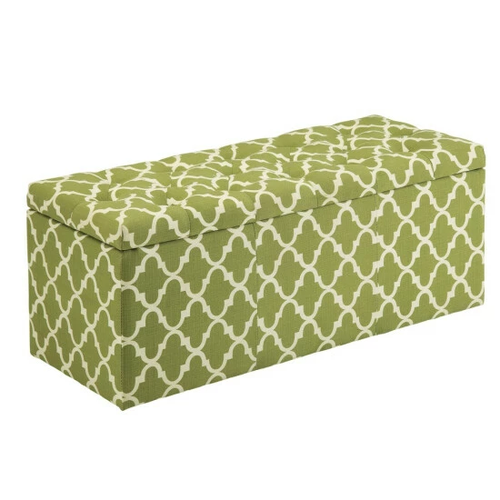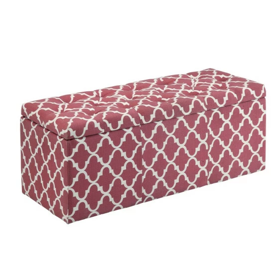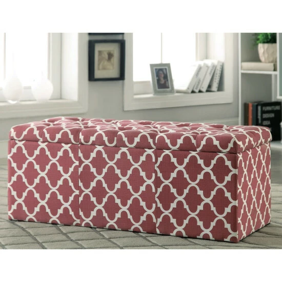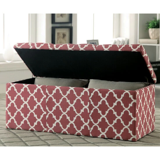 Give your home a sudden jolt of energy with the vibrant design and cute functionality of this contemporary style storage bench from Furniture of America. Featuring a pop of color in a quatrefoil print motif that stylishly electrifies any space, this padded bench is carefully constructed with linen-like fabric to simultaneously provide increased seating space and enhance surrounding home decor. Diamond and panel stitching add elegant detail while foam cushioning ensures lasting comfort. With a spacious lift-top compartment, the storage bench brings functionality and colorfully comfortable design to your home. Keep it handy for an extra seat when you have a full house of guests, or use it as storage behind your favorite living room sofa or as storage at the foot of the bed. Available in multiple colors that suit your tastes.