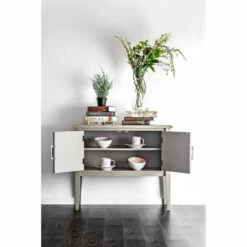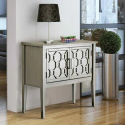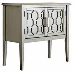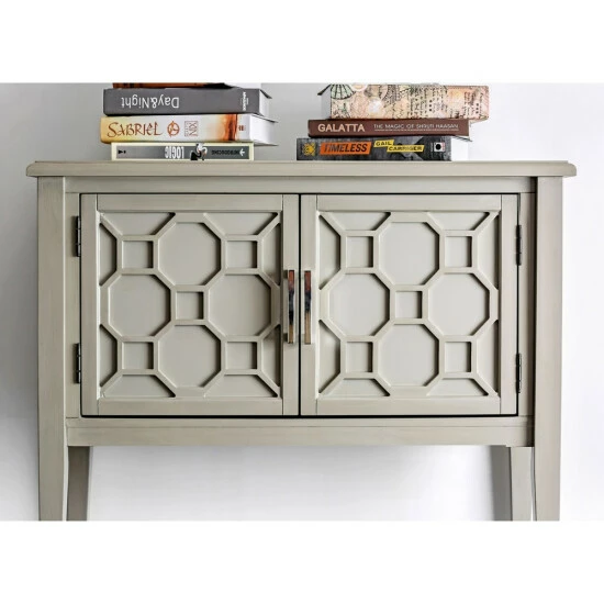 Add a unique storage option to your home with the Gela Contemporary two-shelf Grey Hallway Cabinet from Furniture of America. This cabinet features a sturdy wooden construction in a grey finish, providing a hint of glam with modern and contemporary flair. Two side-by-side cabinets with bar pulls provide storage with an octagonal door front motif to add plenty of character to your space. Inside, there are two shelves to conceal belongings out of site. Its structure is enhanced by slim tapered legs to complete the look. This grey hallway cabinet is made from solid wood and veneer for a sturdy structure, ready to adorn your entryway for years to come.