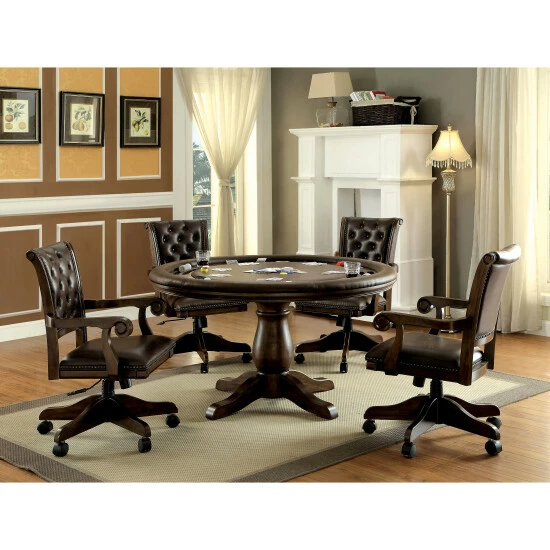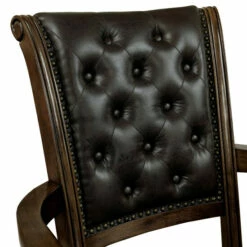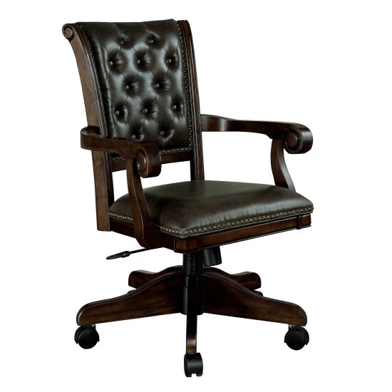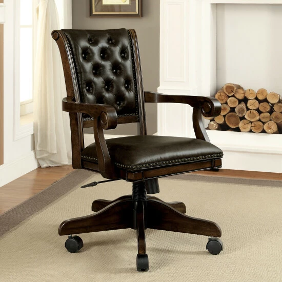 Enjoy poker night from the comfort of this traditional style and adjustable desk chair, made by Furniture of America for the eye-catching Genn collection. This piece is enhanced with sleek padded fabric in a faux leather material and mobile caster base for mobility. Armrests with a dramatically curved design provides an additional level of comfort for your workday. The button tufting and nail head trim add an elegant touch to the height adjustable chair for a piece with style and function. Choose this black and brown office chair to make a prestigious impression at work or in your home office.
