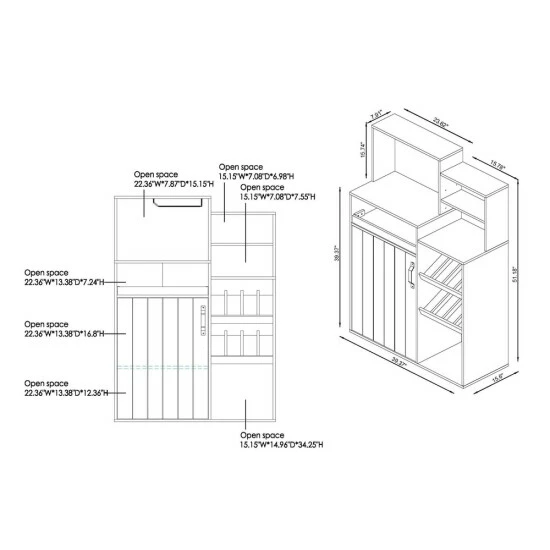 - Interior upper left shelf: 15.15 inches high x 22.36 inches wide x 7.87 inches deep