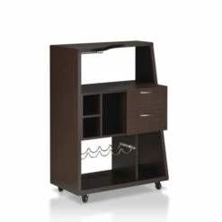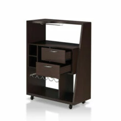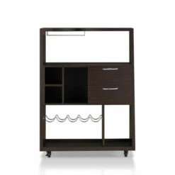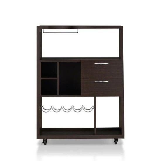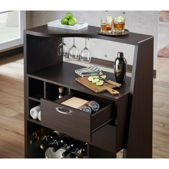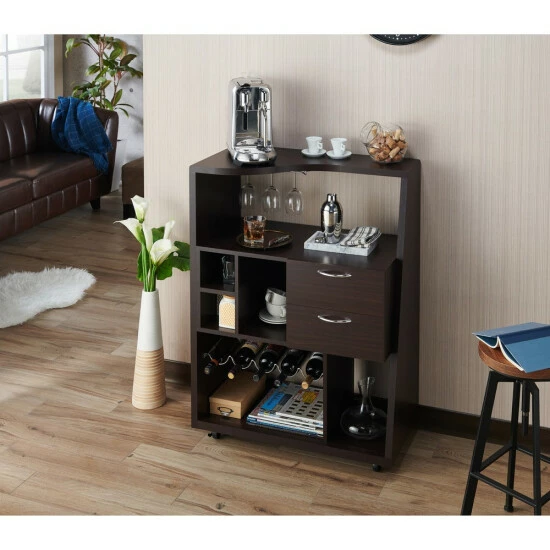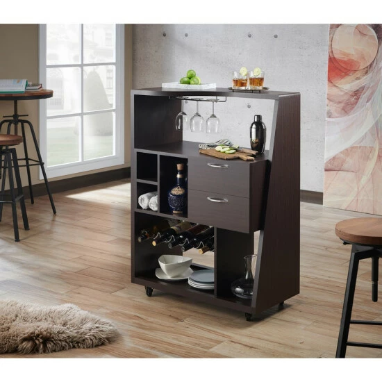 A handy addition to any modern home, this contemporary two-drawer mini bar is a compact piece perfectly suited to make you the ultimate host or hostess. The rich, warm walnut finish masks the MDF construction with subtle, wood grain detailing. The generous, open shelves give you a wide variety of options to store serving essentials or display fine dinnerware. The two slide-out drawers feature gleaming metal handles and metal glides for easy access to their contents. Complete with five wine bottle compartments and an upper stemware rack that fits up to three glasses, this chic, unique piece is the ultimate complement to home entertainment.