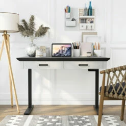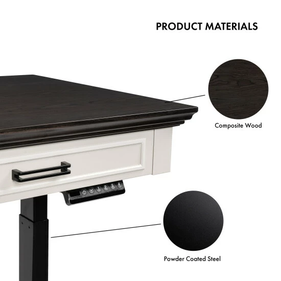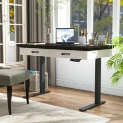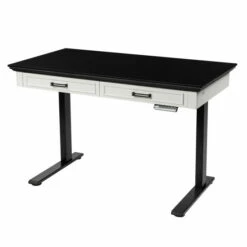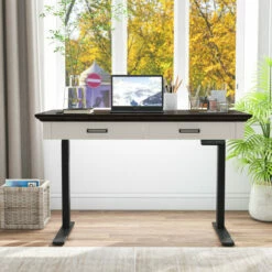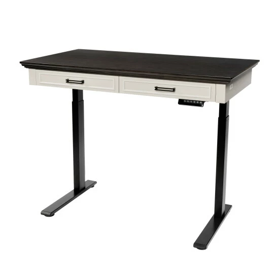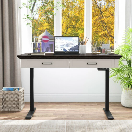 Create a whole new home workspace with this adjustable standing desk with a wood top and easy one-touch operation. It features a pair of drawers for easy storage while a modern metal base is easily adjusted to the perfect height for working while standing.