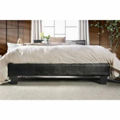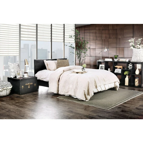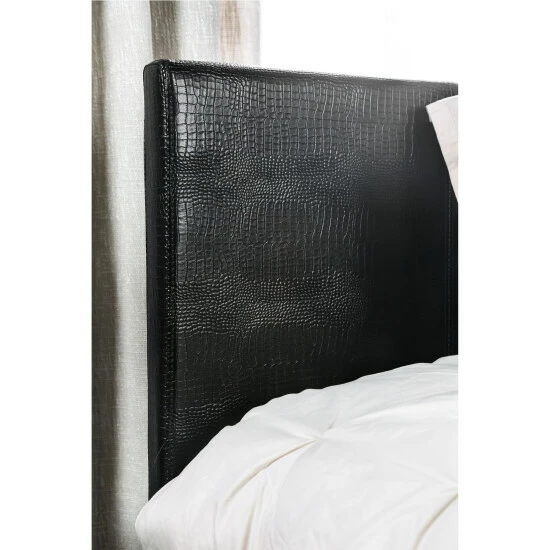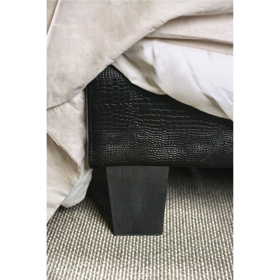 Slick modern style with a low-profile aesthetic and build brings attitude to a contemporary master or guest bedroom, focusing on a minimalism that works in today’s trending designs. The Gols modern black faux leather platform bed offers an opportunity to embellish custom linens and décor while offering its own striking aesthetic. A solid pine wood frame delivers a sturdy look and feel, with a mid-height headboard and low footboard. A padded frame wrapped in black faux leather offering a slight crocodile skin textured design makes its exotic vibes come through. Deep espresso finish tapered legs add a compatible element. This mattress-ready platform bed arrives with a Euro-style slat kit and requires no box spring or foundation.