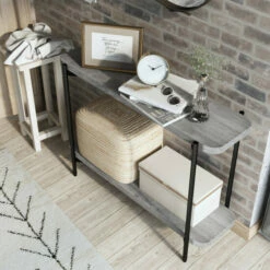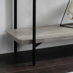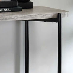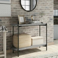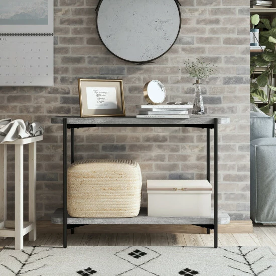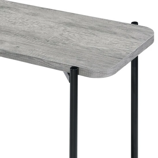 This industrial grey sofa table from Furniture of America gives your home a warm, inviting look and feel. It comes with a sleek steel frame layered in a sand black coating for stability with style. Handsome light grey tabletop and shelf with rustic wood grain details add a contrasting hue that softens the steel industrial edge of the frame. Both the top and open bottom shelf have rounded edges and provide plenty of space for display of your favorites like picture frames, lamps, knickknacks, and more.