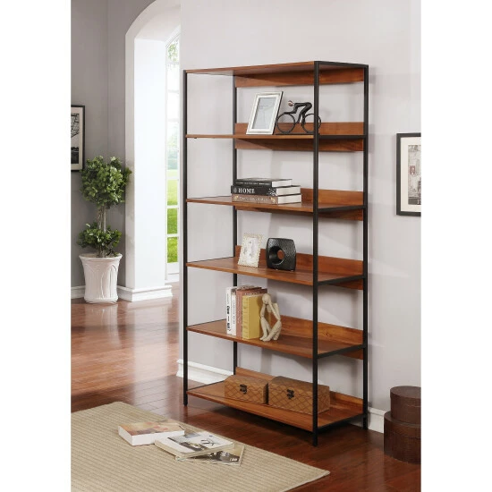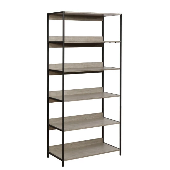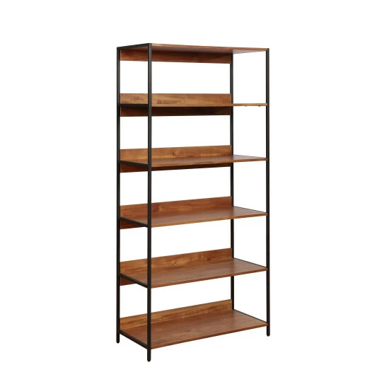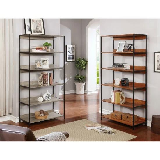 This six-layer bookshelf has enough shelving and space to store everything from leather-bound novels to candles and knickknacks. Crafted for the Gramada collection, this piece is ideal for an office, living room, or storage room. Each bookshelf features a sandy black frame over MDF, Acacia veneer, and metal construction. The metal framing comes in a washed finish that gives it an attractive aged appearance. It provides a modern and contemporary feel and serves as an excellent solution for organizing your favorite collections. This is a tall six-tier bookshelf standing at 72 inches high. Watch how it simultaneously transforms and organizing your living space.