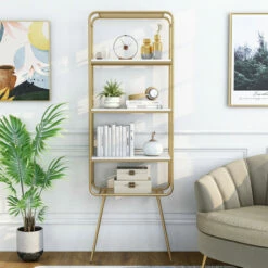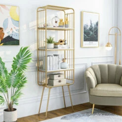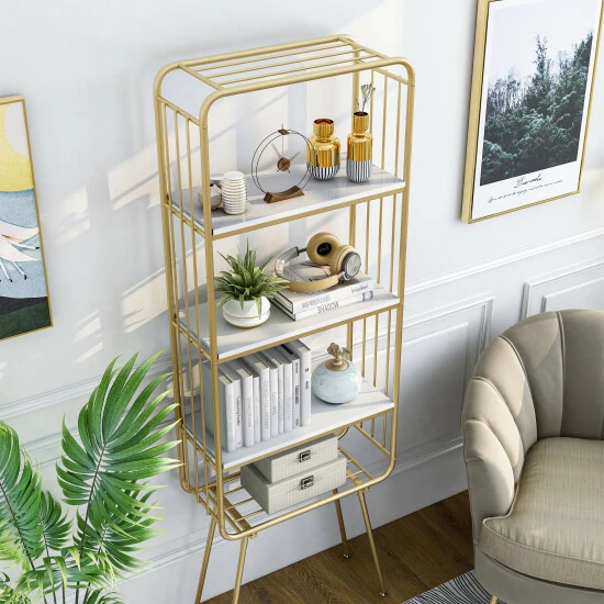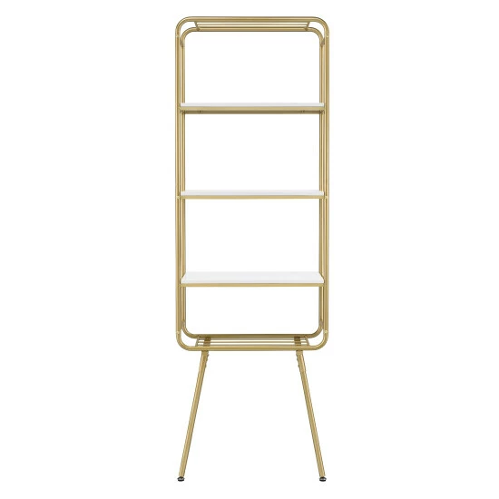 Bring a hint of glam style to your modern living area or home office with this cool gold and glossy white bookcase. Its elevated design and open, metal framework pair to perfection, creating a bold and engaging piece perfect for storage and display.