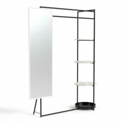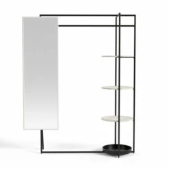 Put the finishing touches on a stylish foyer with this impressive contemporary coat rack. In a bold two-tone finish, this spacious coat rack features a full length mirror with a white finish frame. A horizontal hanging bar is idea for coats and accessories, creating an easy spot for visitors to stash their outerwear. Three white shelves and one tray shelf create plenty of space for decor or small accessories you’d like to keep at hand.