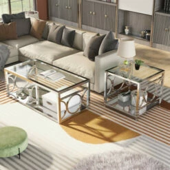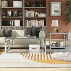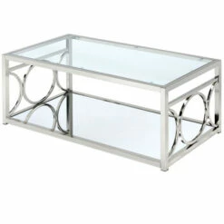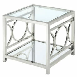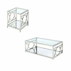 An elegant addition to your living space, this chic coffee and end table set by Furniture of America offers gorgeous visuals while durably constructed with metal and glass. Made for the gorgeous Gury collection, the circular side designs draw attention to the mirrored bottom shelves bottom shelves, where you can easily store and display your favorite decor items. Meanwhile, tempered glass tops expand the open appearance. This chrome two-piece set is beautifully finished to make an attractive and contemporary display in your living area. Perfect for adding pizzazz and a sense of glam, enjoy how this coffee and end table enhances the appearance of your living area.
