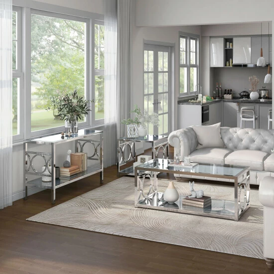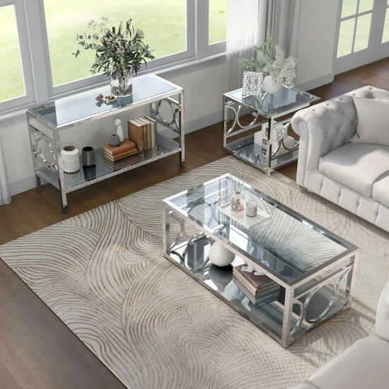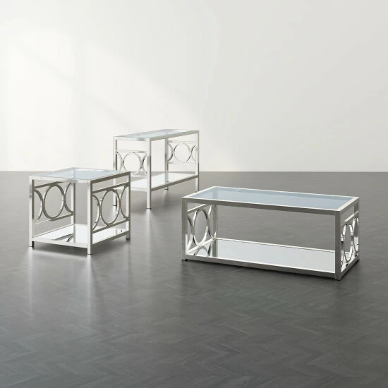 An elegant addition to your living space, this accent table set by Furniture of America offers gorgeous visuals. Circular side designs draw attention to the mirrored bottom shelves, where you can easily store and display your favorite decor items. Meanwhile, tempered glass tops expand the open appearance. This chrome or champagne three-piece set with a coffee, end, and sofa table is beautifully finished to make an attractive display.