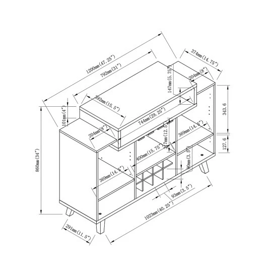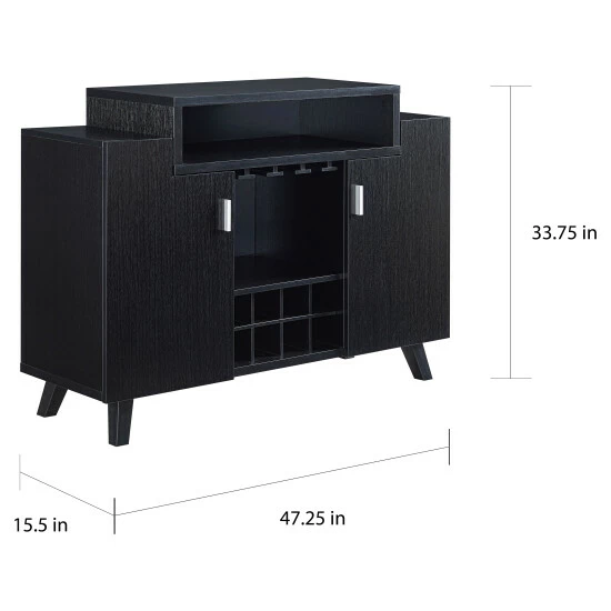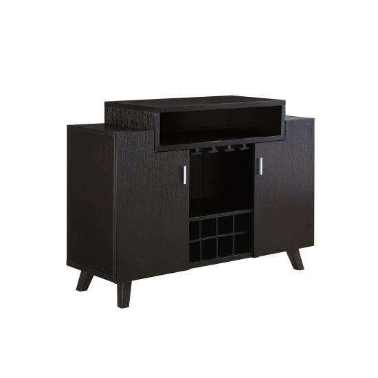 Enter an engaging piece of contemporary style and substance with this utterly charming buffet. The buffet built with an eight-bottle grid wine rack and storage for glasses so you’re ready to pour a favorite vintage for friends and family. Two side cabinets and open shelves create a place for easy storage and sophisticated display.