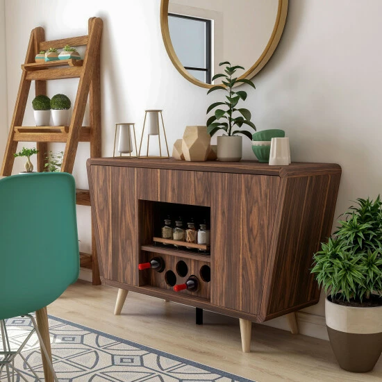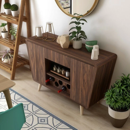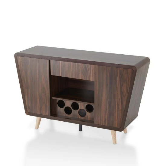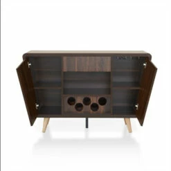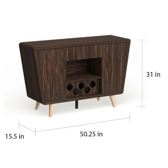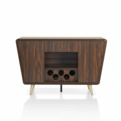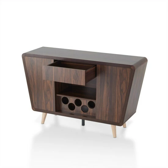 Step into the mid-century modern style when you select this Furniture of America Hai transitional walnut 50-inch 2-cabinet buffet. This buffet has a dark walnut finish and two cabinets with two shelves each. A circle cut-out wine bottle rack adds style even when empty, providing a place for up to five of your favorite vintages to be kept close at home.