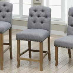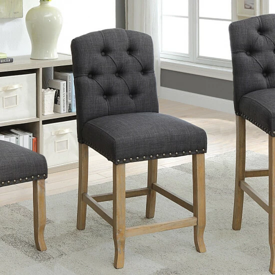 Make an elegant mark on your dining room with this set of charming counter chairs. Each of these armless bar height dining chairs offer a deeply button-tufted, camelback seat and are a study in texture with their faux linen upholstery, available in various light and dark shades. Supported by tall tapered legs in a distressed finish, these chairs are sure to elevate your decor in an instant.