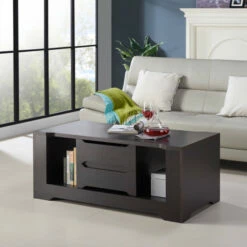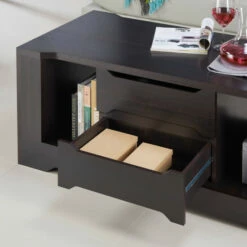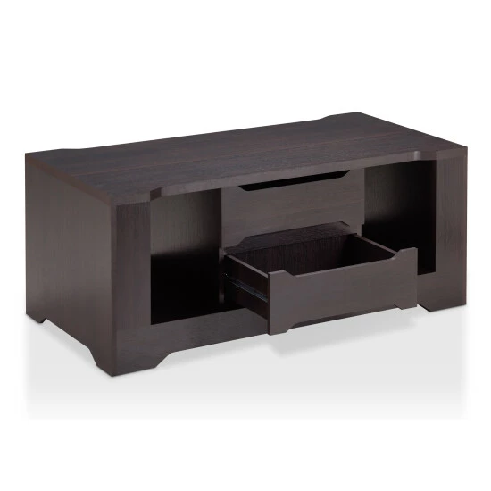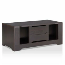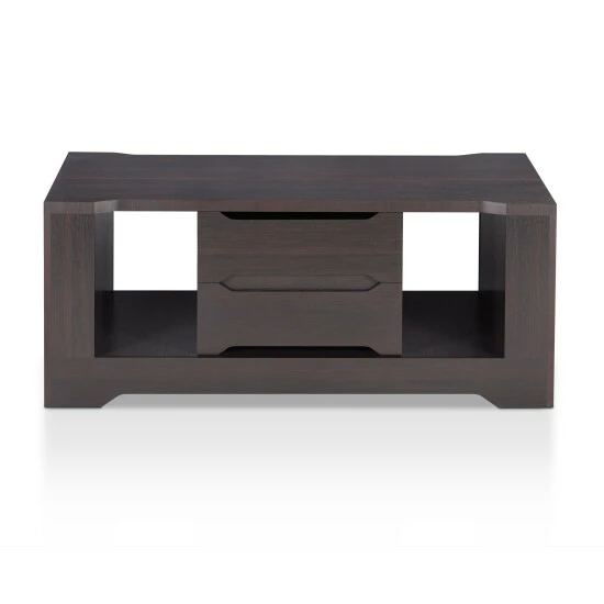 Whether in need of hiding messy clutter or displaying prized belongings, this espresso coffee table by Furniture of America has plenty of storage options to organize your living space. Made for the Halin collection, the clean linear lines are paired with subtle angular accents for a sleek design with modern inspiration. Shelving units provide the perfect space to store decor and reading materials which are accessible from each side of the coffee table. Drawers with recessed handles make it easy to store away small items that you need within reach. The spacious tabletop enhances the functionality of this espresso coffee table, supported on a platform base.
