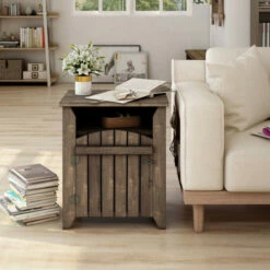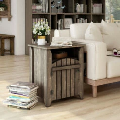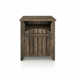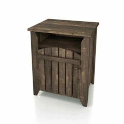 Utterly charming and wonderfully unique, this little end table set is sure to catch the eye while offering a space to tuck away necessities. The design is inspired by a front gate, lending a touch of farmhouse flair perfect for enriching decor. Behind the door are two shelves for organization and just a hint of display in the window cutout below the top.