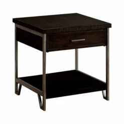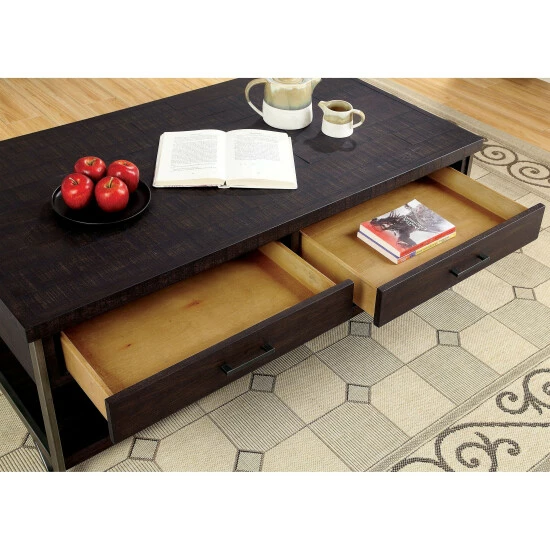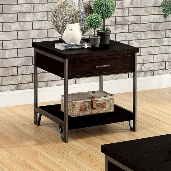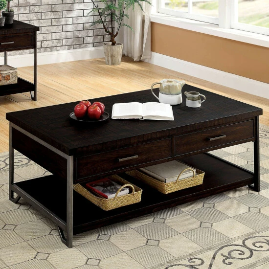 The best of industrial-themed interior décor reflects careful design and an impressive dose of livability. Adding a sophisticated look along with casual charm, the Hawkins industrial two-piece accent table set from Furniture of America delivers that plus more. This inspiring set creates definition, refinement, and ample space to store, serve, and become an integral part of a transitional family living space. Solid wood and wood veneer construction lends a sturdy look and feel to a rectangular coffee table and nearly square end table, both anchored to sleek open metal frames. With a dramatic dark oak finish, they deliver character as well as versatility. Drawer storage on both pieces is extra convenient, and a lower shelf opens up space for storage and display. Choose this stylish set to set a pace for carefree yet attractive décor.