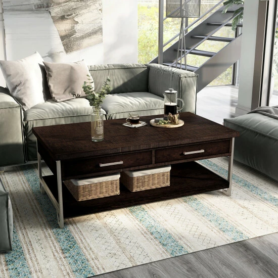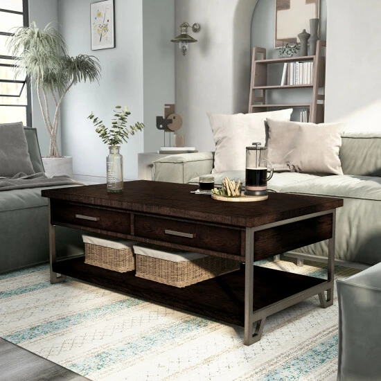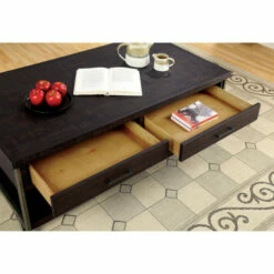 The best of industrial-themed interior décor reflects careful design and an impressive dose of livability. Adding a sophisticated look along with casual charm, the Hawkins industrial coffee table from Furniture of America delivers that plus more. This inspiring table creates definition, refinement, and ample space to store, serve, and become an integral part of a transitional family living space. Solid wood and wood veneer construction lends a sturdy look and feel to a rectangular coffee table anchored to a sleek open metal frame. With a dramatic dark oak finish, it delivers character as well as versatility. Drawer storage is extra convenient, and a lower shelf opens up space for storage and display. Choose this stylish coffee table to set a pace for carefree yet attractive décor.