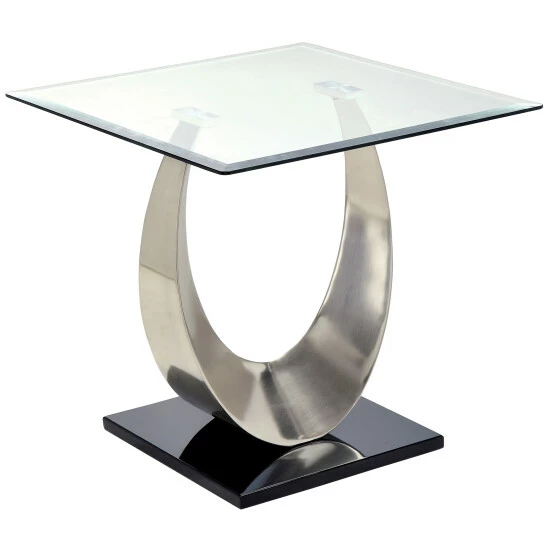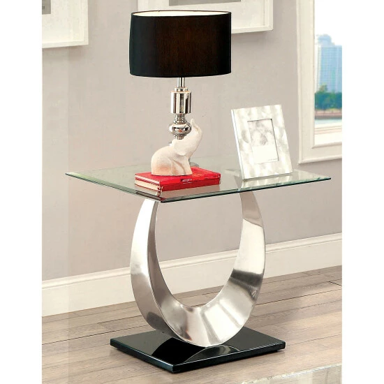 Gallery-inspired design melds sleek materials with a heady silhouette, producing an artisan end table fit for a custom contemporary space. The Heer silver coffee table from Furniture of America captures the spotlight as a focus element in a living room or family entertaining space. Embrace a blend of glass and metal with extraordinary shapes and finishes. Satin-plated silver finish metal delivers an Art Deco look in a table body with a U-shaped curving profile resting atop a tailored slab of glossy black finish metal, as a gleaming sheet of clear tempered, beveled glass delivers a tabletop showcasing a transparent look that adds an expanded view of its opulent design. Choose this end table to make a fashion statement in a decadent custom room.