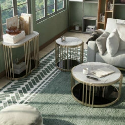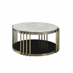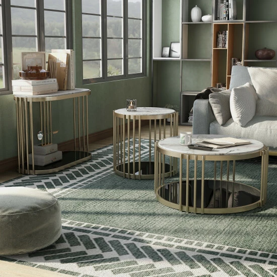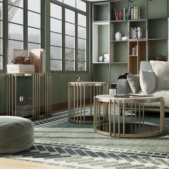 This set of accent tables wears elegance. Faux white marble tabletops are held by an antique brass-plated frame. The staggered bar design of the drum base is an art deco dance. Black tempered glass shelves give the tables a deep and moody look.