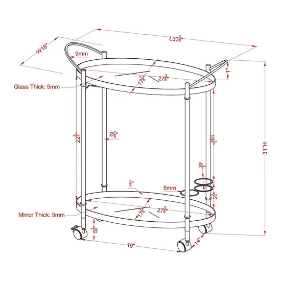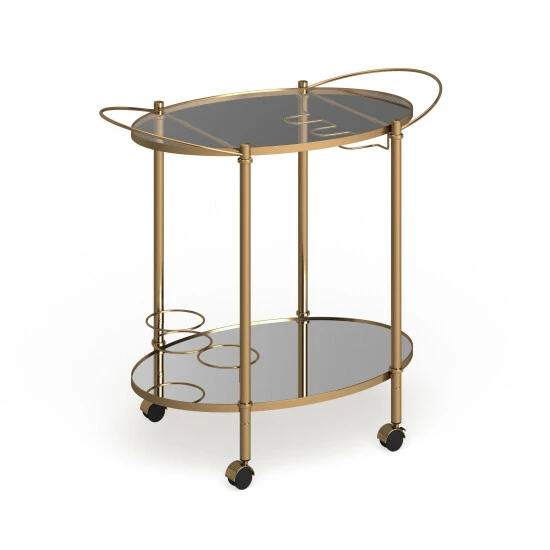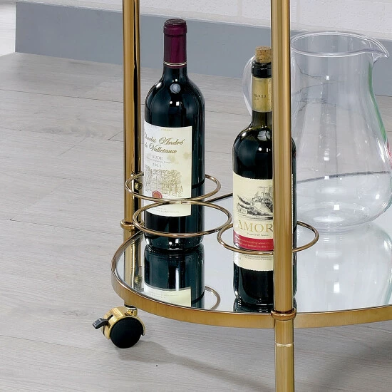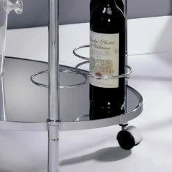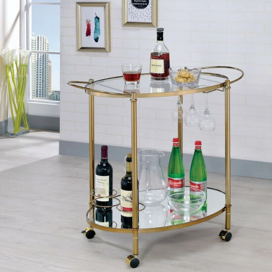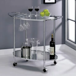 Scaled down simplicity preserves a refined look in a serving implement you’ll want to have around. The Hic contemporary single-shelf metal serving cart from Furniture of America keeps it easy and low-profile for hosting small shindigs or family evenings by the fire. An oval silhouette highlights a metal frame nestling a mirrored lower shelf and tempered glass top surface, both of which open up space for placing glassware, serve ware, and snacks. A three-ring unit secures standard-size wine/beverage bottles on its lower shelf. Slender rounded handles make it simple to navigate from room to room or guest to guest, with the help of easy-glide caster wheels.