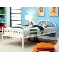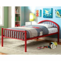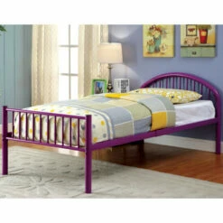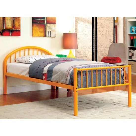 Give your child or teen a colorful and vibrant bedroom with this attractive, modern bed from the Furniture of America Hind collection. Made from high-quality, durable metal, this slat-style bed offers a gently arched headboard and straight footboard, each with slat-style tubes. This furniture piece also comes mattress ready with no box spring required, saving you money right away. This kid-friendly bed comes with an open foot board, allowing a comfortable night’s sleep as your child grows. Available in a variety of bold and striking color options, such as green, orange, purple and silver, this youth bed has a high-gloss powder coating that is made to last and can take a beating.
