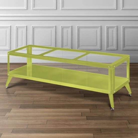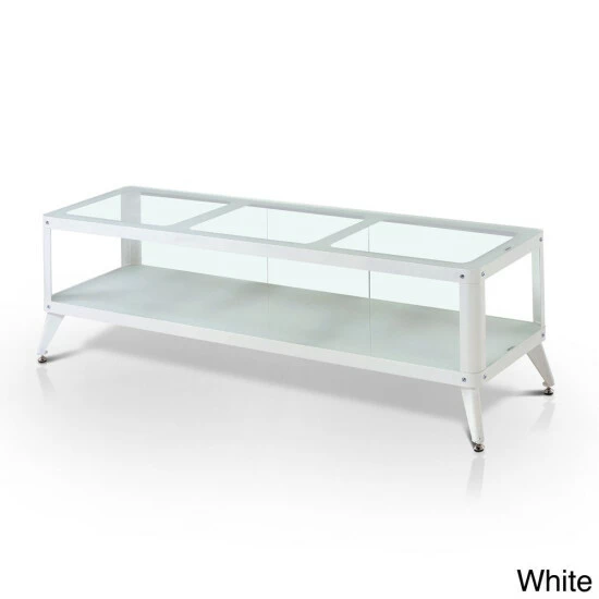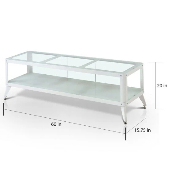 The Hind TV Stand is chic and stylish, sporting a full metal construction and tempered glass top. Available in 60 and 72-inch options, it provides an exceptional viewing experience for movies, games and more. Open shelf stores your entertainment devices as rear-access makes wiring simple and easy. Supported on pointed angular legs and accented by chrome nail heads, it brings chic Modern simplicity to your living space.