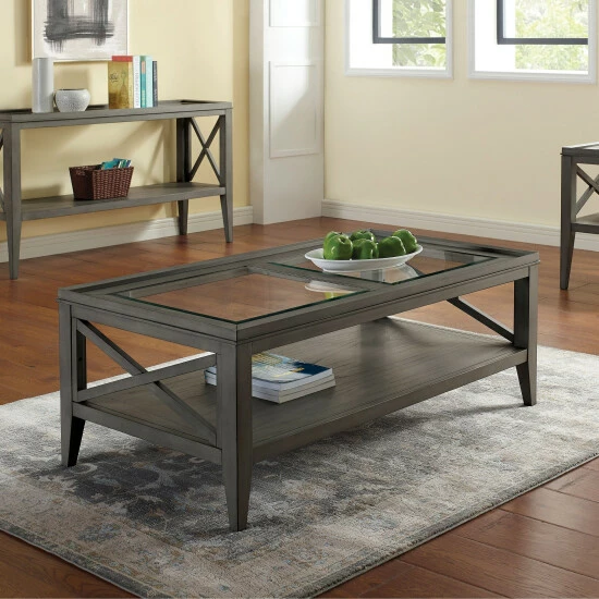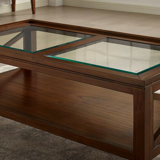 The cozy feel of Mid-Century Modern design makes its way into a sweet, casual coffee table styled for ultimate versatility. The Hinz transitional solid wood coffee table offers a graceful silhouette building on a minimalist look with subtle, stylish details. Built from solid wood and wood veneers, this delightful table receives a beautiful, versatile finish that embellishes today’s trending design palettes. A slightly tapered profile features straight legs with a gentle curving shape. Cross-bar side pieces add a decorative touch, as a lower shelf doubles space for storage and display. A tempered glass insert in its rectangular top delivers a fresh, gleaming upgrade. Choose this coffee table to transform a classic transitional space. Available in two dynamic finishes.