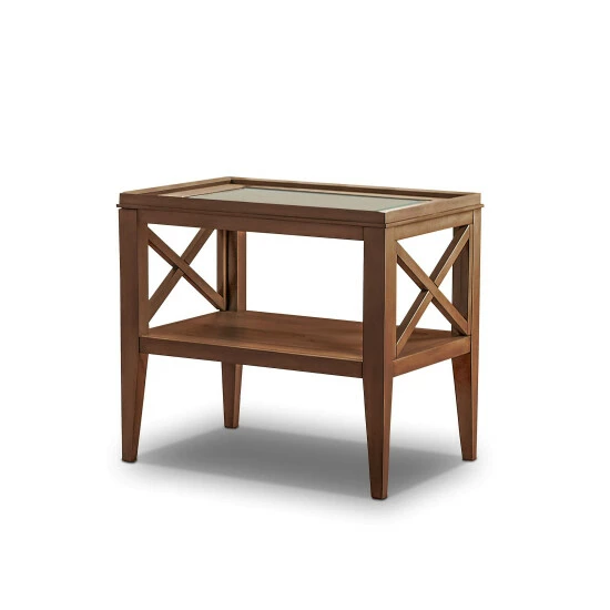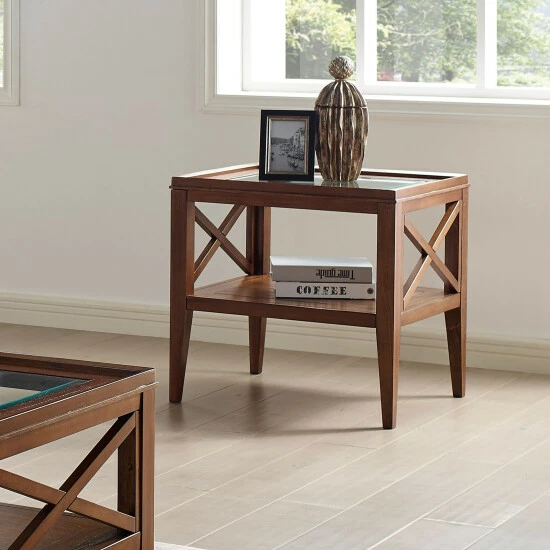 The cozy feel of Mid-Century Modern design makes its way into a sweet, casual end table styled for ultimate versatility. The Hinz transitional solid wood end table offers a graceful silhouette building on a minimalist look with subtle, stylish details. Built from solid wood and wood veneers, this delightful table receives a beautiful, versatile finish that embellishes today’s trending design palettes. A slightly tapered profile features straight legs with a gentle curving shape. Cross-bar side pieces add a decorative touch, as a lower shelf doubles space for storage and display. A tempered glass insert in its square top delivers a fresh, gleaming upgrade. Choose this end table to transform a classic transitional space. Available in two dynamic finishes.