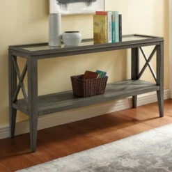 The cozy feel of Mid-Century Modern design makes its way into a sweet, casual sofa table styled for ultimate versatility. The Hinz transitional solid wood sofa table offers a graceful silhouette building on a minimalist look with subtle, stylish details. Built from solid wood and wood veneers, this delightful table receives a beautiful, versatile finish that embellishes today’s trending design palettes. A slightly tapered profile features straight legs with a gentle curving shape. Cross-bar side pieces add a decorative touch, as a lower shelf doubles space for storage and display. A tempered glass insert in its rectangular top delivers a fresh, gleaming upgrade. Choose this sofa table to transform a classic transitional space. Available in two dynamic finishes.