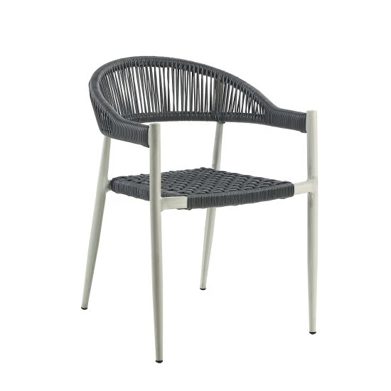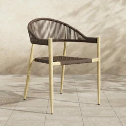 Get ready for a summer staycation with this stylish and unique patio chair. The webbed rope wicker back and seat are a boho vibe, while the tapered legs offer that mid-century modern touch. This design evokes a calm beach scene.